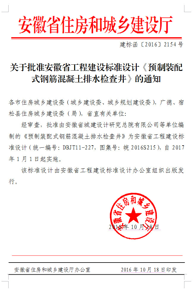 關(guān)于批準(zhǔn)安徽省工程建設(shè)標(biāo)準(zhǔn)設(shè)計(jì)《預(yù)制裝配式鋼筋混凝土排水檢查井》的通知