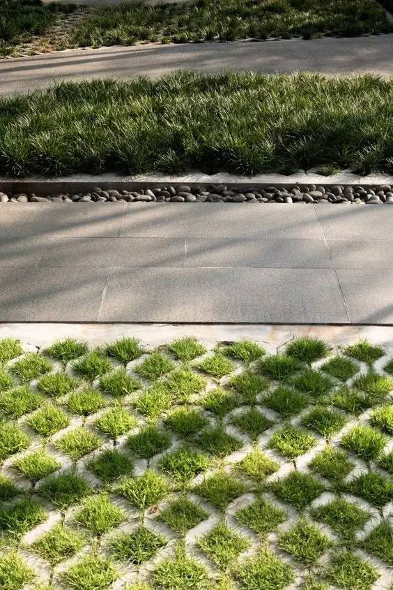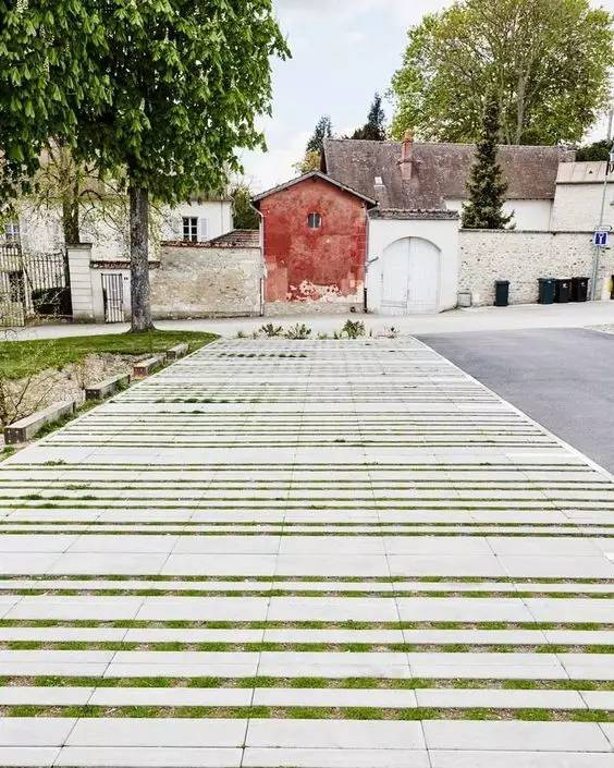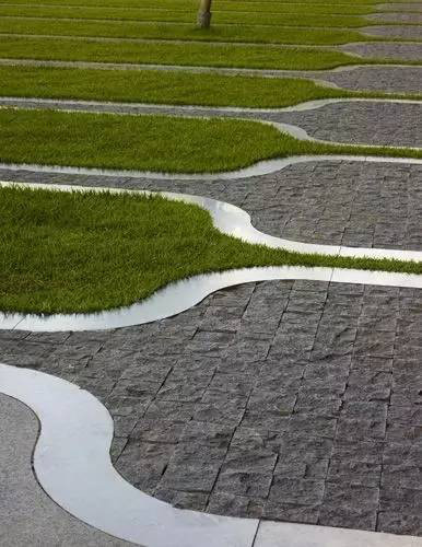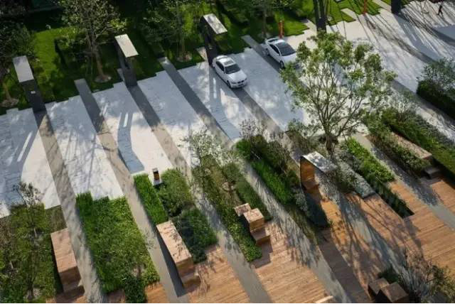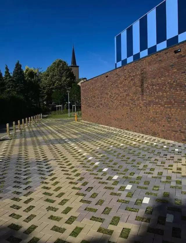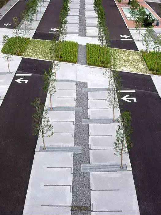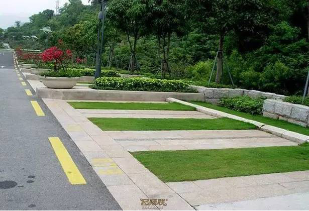 利于更換及修補(bǔ)的防滑鋪裝材料,以及它的透水性,加上鋪設(shè)尺寸符合人體工程學(xué),真是人性、環(huán)保、安全而美觀。而停車場周圍的綠植,起到降溫作用,視覺上也美化了場景,愉悅內(nèi)心,安全出行,再好不過。